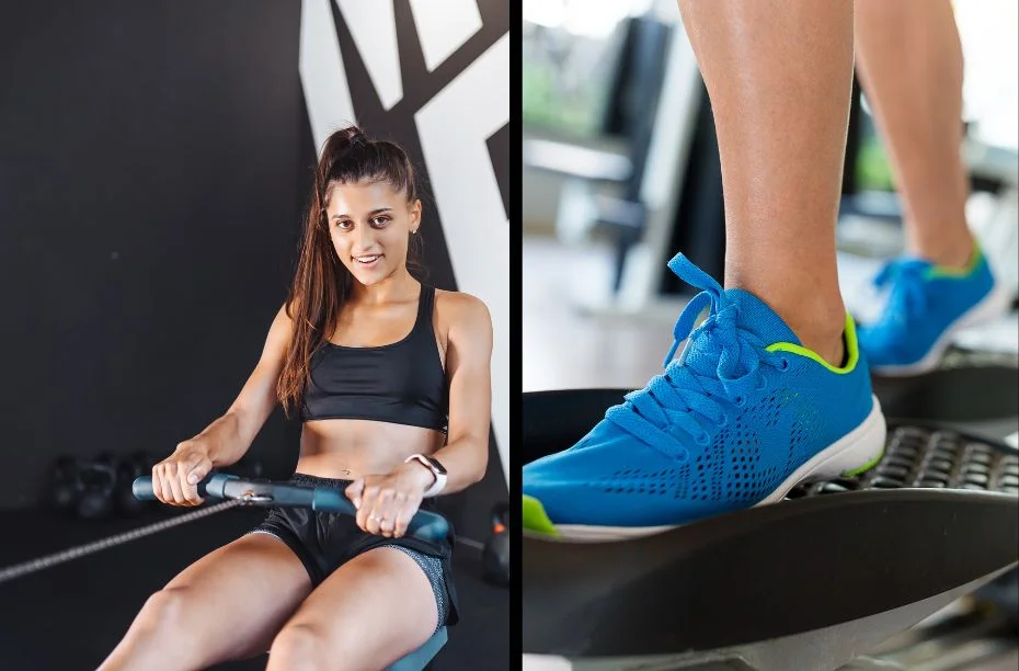 - Benen: Je traint je quads, hamstrings en kuiten, net als bij de roeitrainer.